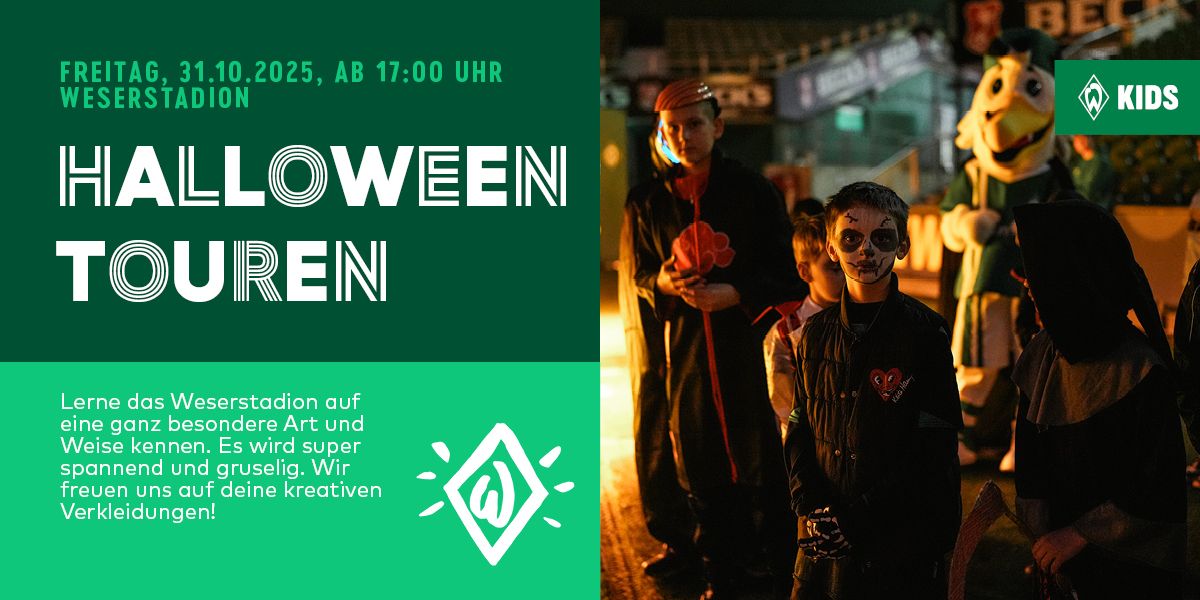 Am 31.10.2025 bieten wir zwischen 17:00 und 19:00 Uhr alle 15 Minuten eine Kids Halloween Tour an. Dabei kannst du das Weserstadion auf eine ganz besondere, schaurige Art und Weise kennenlernen.