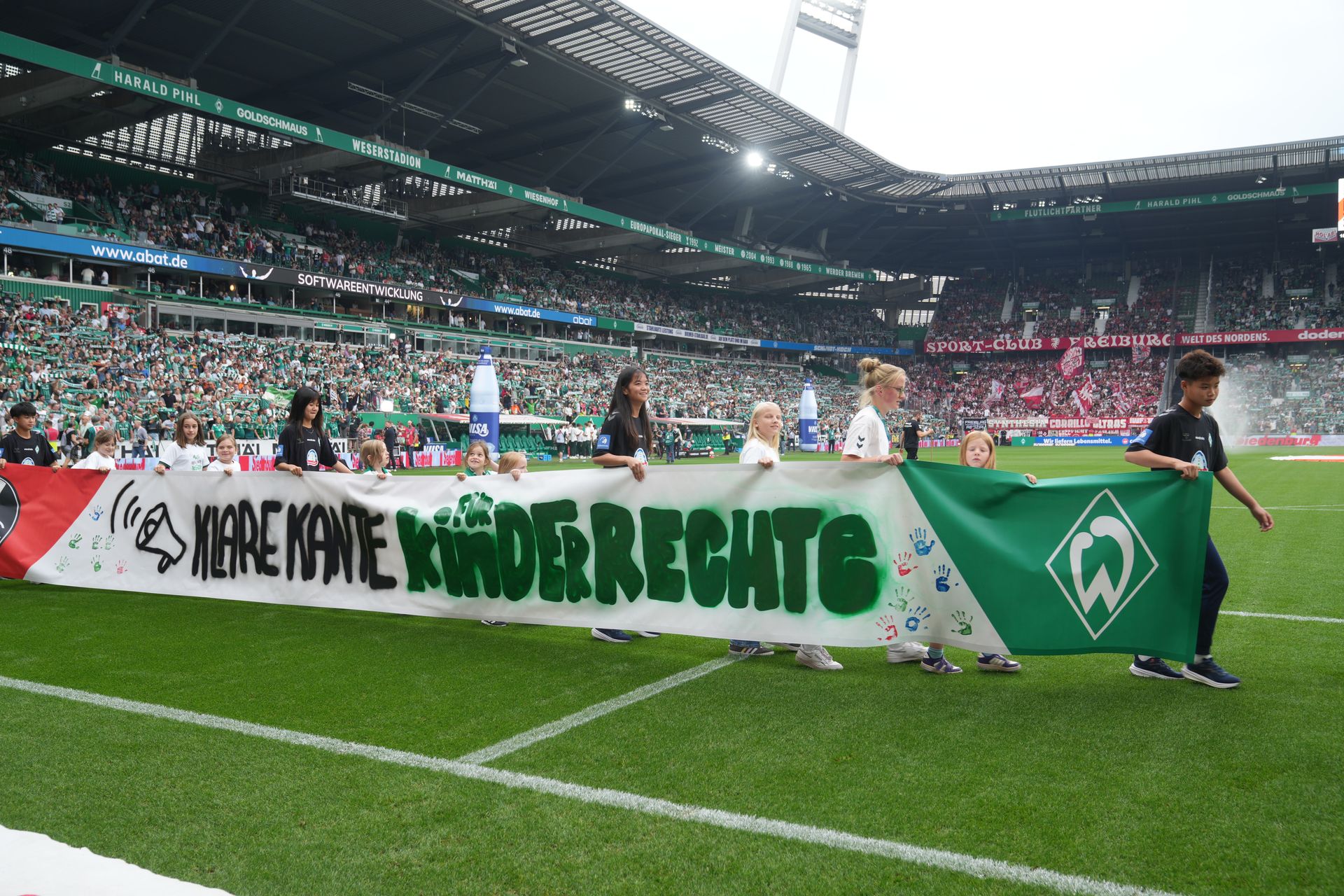 Das Beste kam aber am folgenden Samstag: Die Kinder liefen mit ihrem Banner eine Ehrenrunde durch das Weserstadion. Vor tausenden Zuschauer*innen durften sie ihr Kunstwerkpräsentieren. Ein Moment voller Stolz, Gänsehaut und strahlender Gesichter. Als krönenden Abschluss haben beide Werder Profi-Mannschaften die Banner vor Anpfiff mit den Gastmannschaften hochgehalten und damit ein klares Statement für Kinderrechte gesetzt.