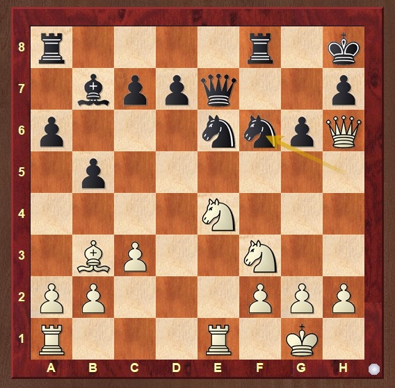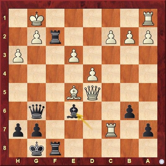 In der zweiten Runde kam es dann zum Duell der beiden Sieger vom Vortag. Es war eine hart umkämpfte Partie: Zunächst stand Anton Weigand mit den weißen Steinen etwas besser, aber Olaf fand erfinderisch einen Weg zum knappen Ausgleich. Aber Remis ist nicht Olafs Sache! Die Stellung wurde erneut kompliziert, Olaf versuchte, einen Angriff zu inszenieren, wurde aber in beiderseitiger Zeitnot hübsch ausgekontert. In der Diagrammstellung fand Anton den eleganten Gewinn!