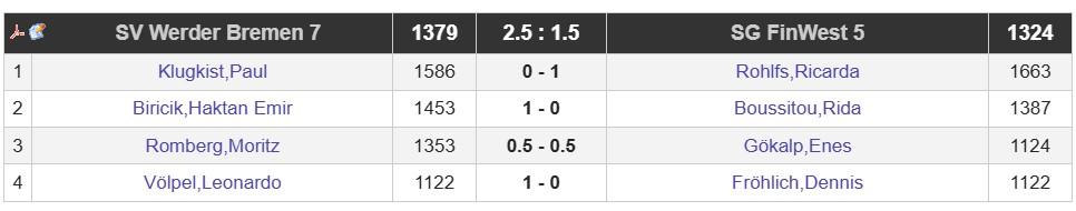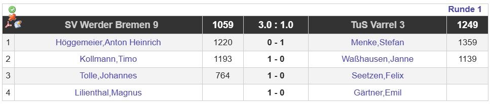 Christian Tolle hat sich in der Sommerpause bereit erklärt die neue Mannschaft Werder 9 zu übernehmen und durch die D-Klasse zu führen, die aus lauter talentierten Kindern und Jugendlichen besteht. Nur drei von 13 nominierten Spielern haben bis jetzt eine DWZ-Zahl. So ging es in der ersten Runde gegen die dritte Mannschaft vom TUS Varrel. Herausgekommen ist ein toller erster 3-1-Sieg! Gratulation!