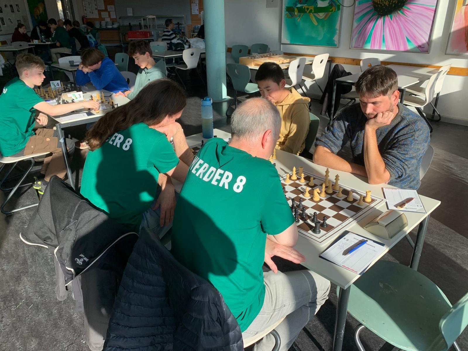 Mit einem DWZ-Überschuss von 112 Punkten hätte das zum Siegen reichen sollen, allerdings konnten nur Gary und Frederick souveräne Siege einfahren, während Noah die Dame in totaler Gewinnstellung einstellte, und Yannik ein remisliches Turmendspiel verlor. So gab es ein gerechtes 2.2-Unentschieden, aber auch irgendwie lange Gesichter. Das hatten wir uns ganz anders vorgestellt.